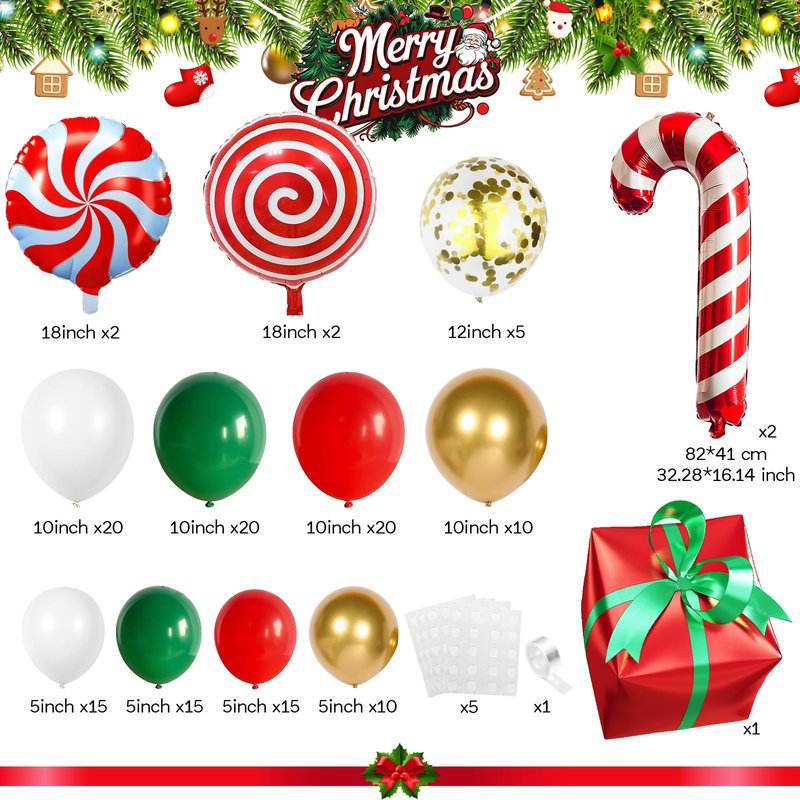 - Value Package: Our 139pcs Christmas balloon garland kit decorations set includes red balloons (5 inch 15pcs, 10 inch 20pcs), dark green balloons (5 inch 15pcs, 10 inch 20pcs), white balloons (5 inch 15pcs, 10 inch 20pcs), metallic gold balloons (5 inch 10pcs, 10 inch 10pcs), 12 Inch gold confetti balloons 5pcs, foil balloons set (2 style 18" red candy 4pcs, candy cane 2pcs, gift box 1pc), 16ft balloon strip tape (1 roll), 100pc glue dot.