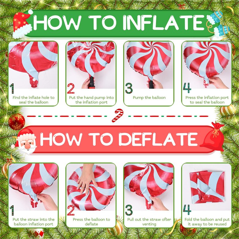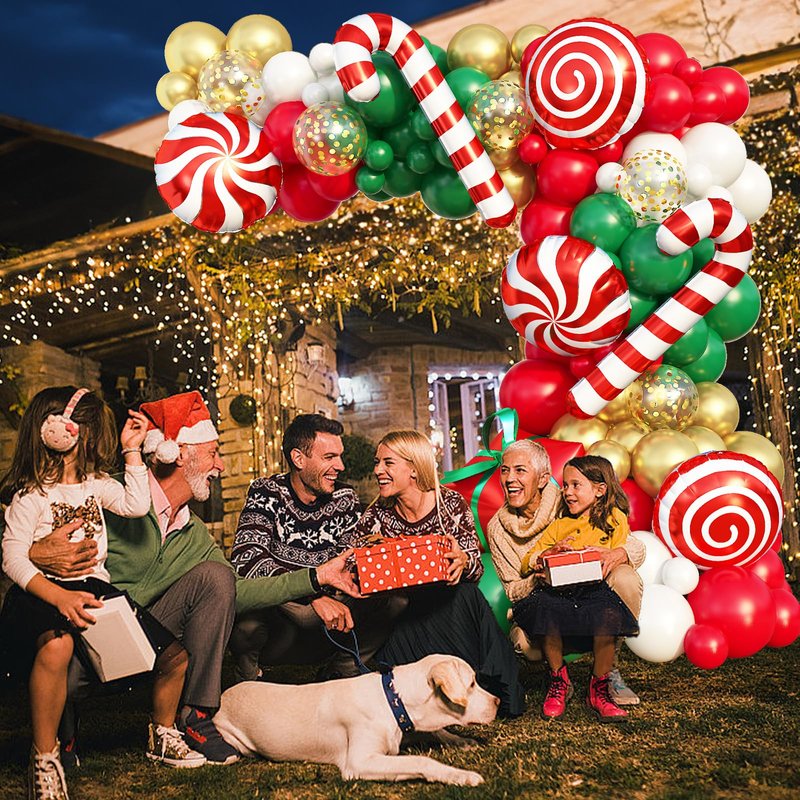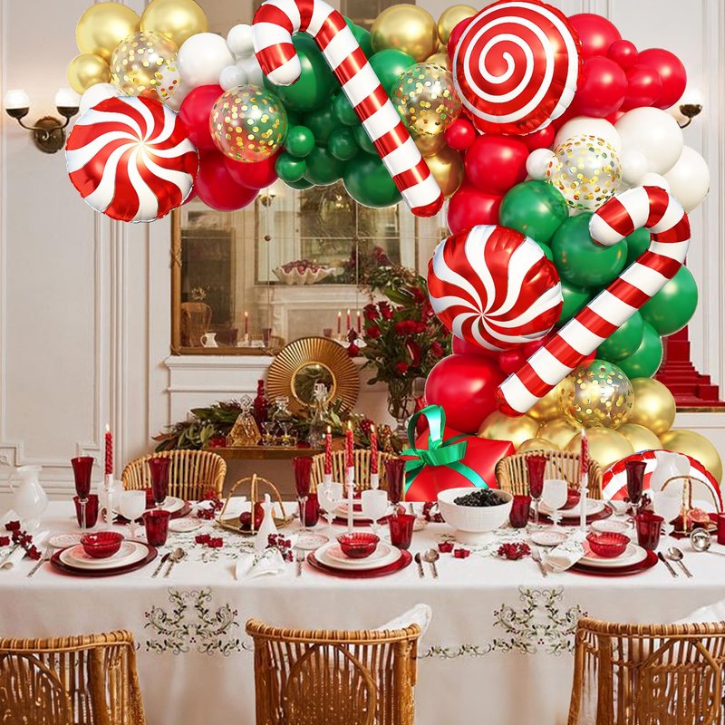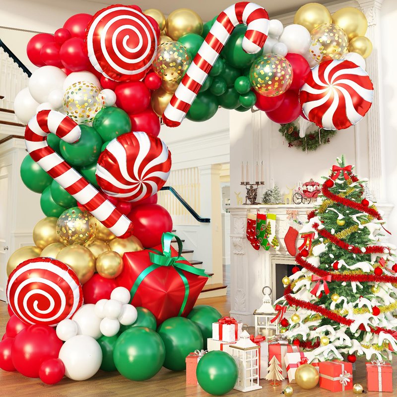 - Christmas Theme Party Decorations: Use our Christmas party decorations balloon garland arch kit come with large Xmas candy cane foil balloons can add more fun atmosphere. With different sizes red, dark green, gold and white balloons, create a unique backdrop and have a cheerful and wonderful Christmas decor party!