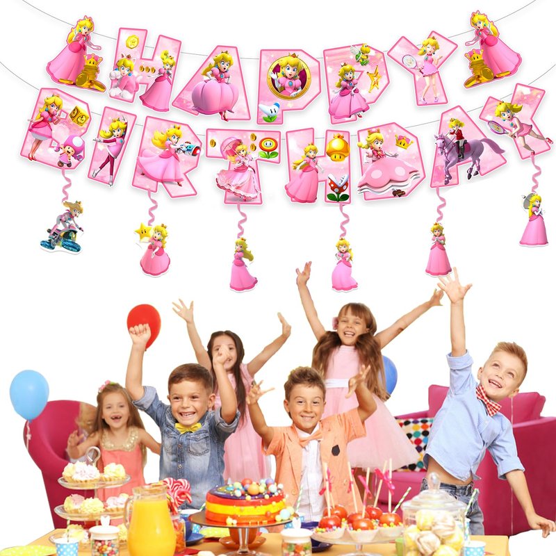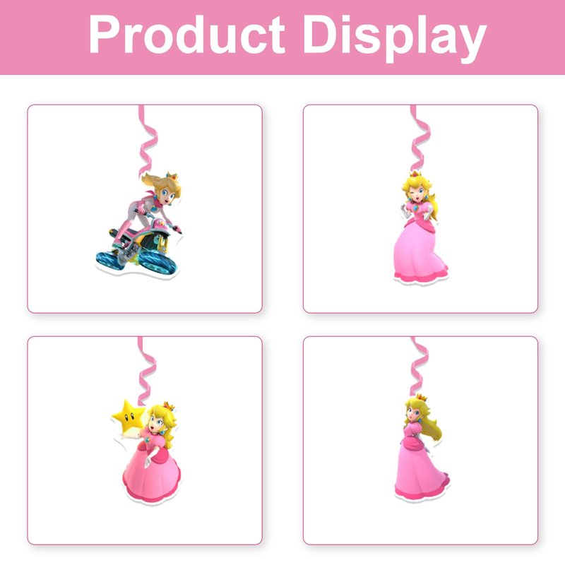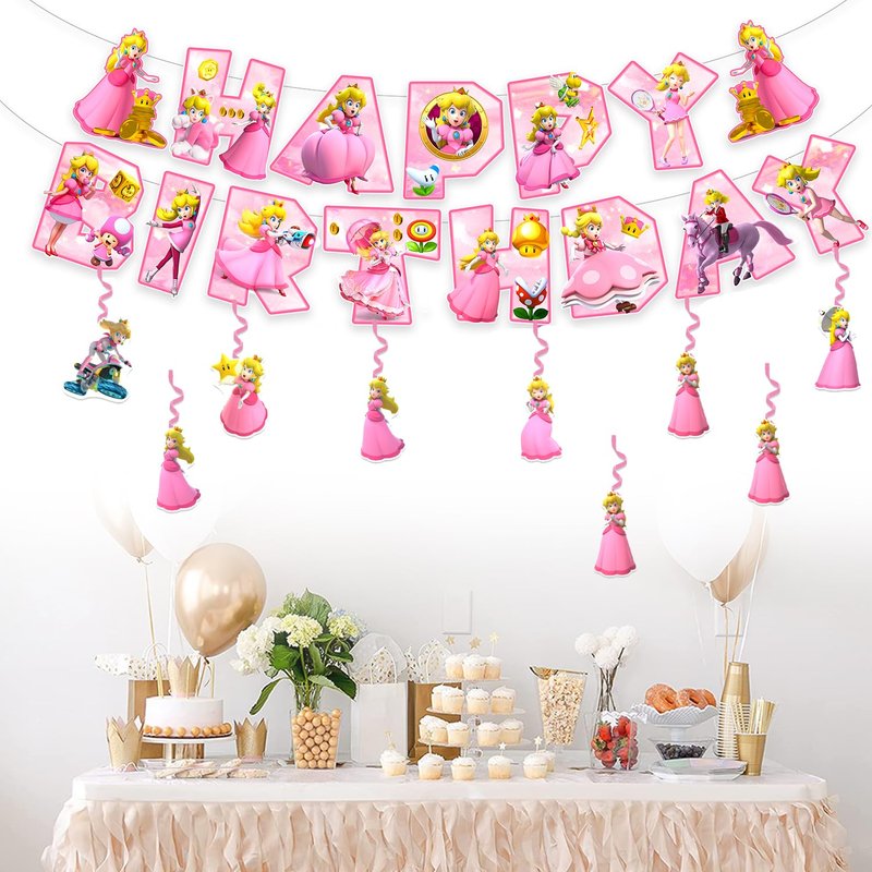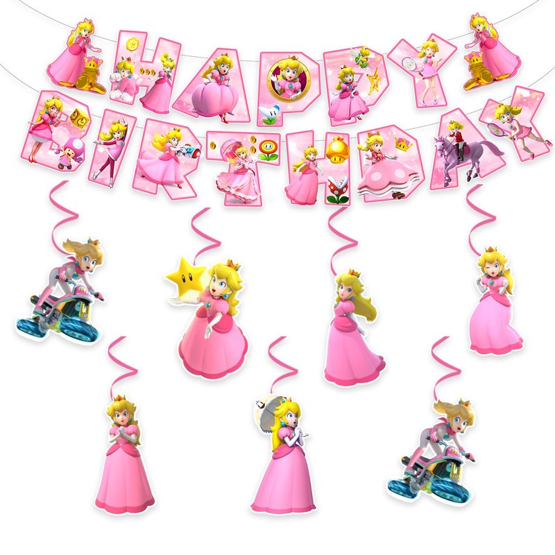 13Packs Princess Peach party supplies Include 12 pcs Hanging Swirls and 1 Happy Birthday Banner for Princess Peach party Decoration
