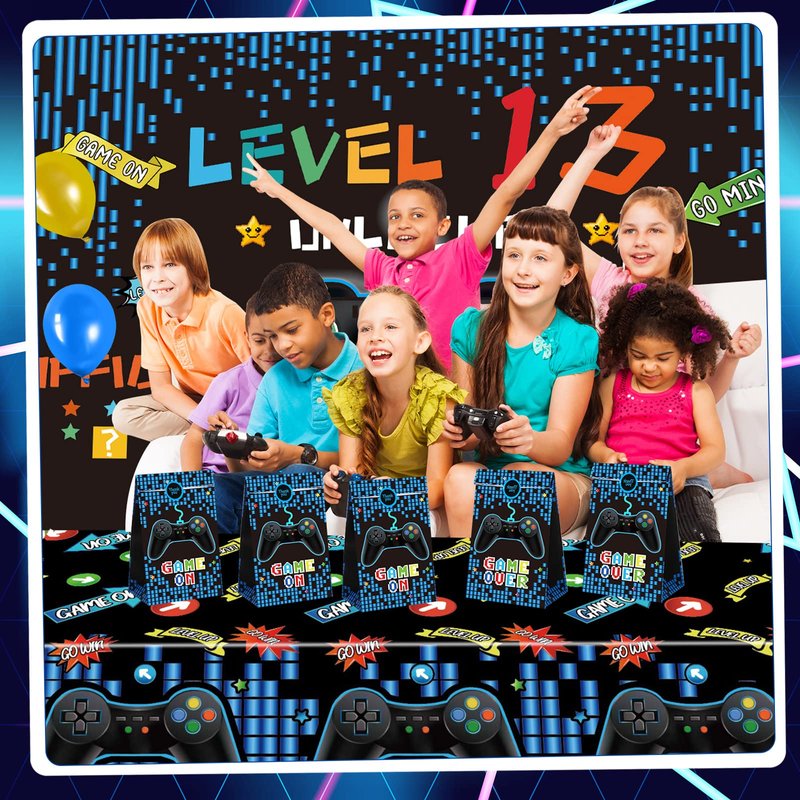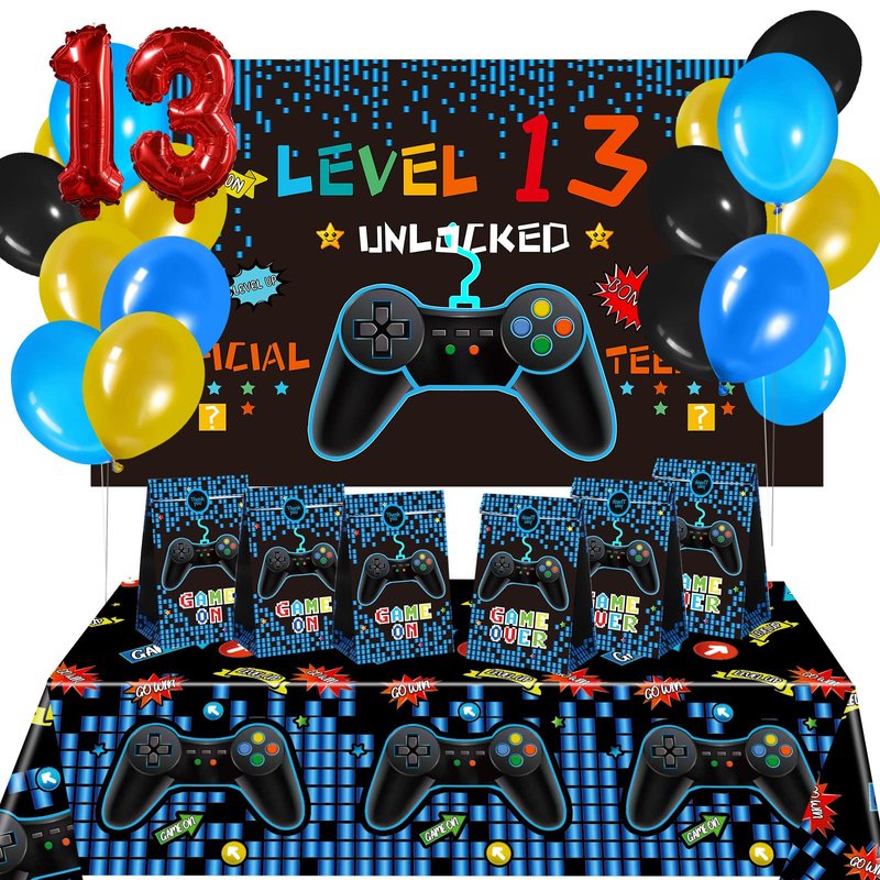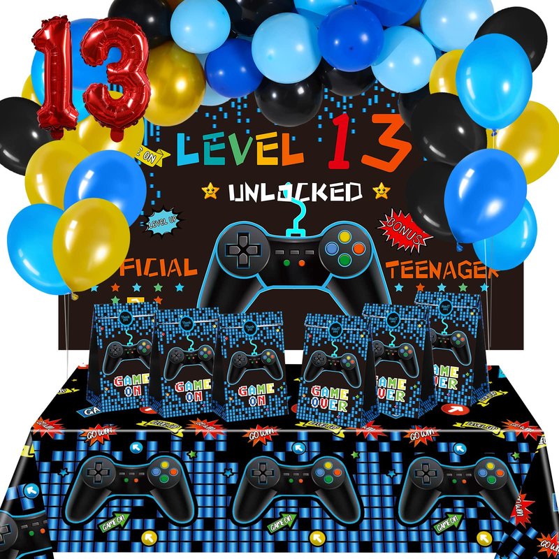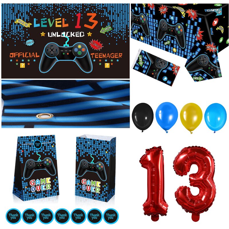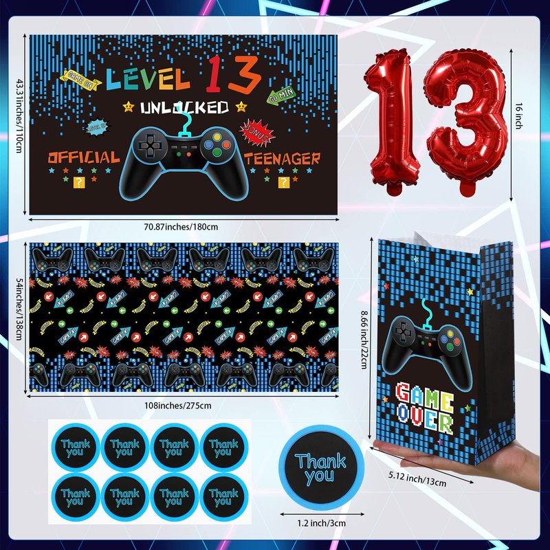 - Level 13 Video Game Party Supplies: package includes 1 piece of backdrop for birthday party (110 x 180 cm/ 43.31 x 70.87 inches), 1 piece of game tablecloth, 50 pieces of balloons(10 inch and 12 inch), 1 set of 2 number "13" balloons (16 inches), 12 pieces of gamer party treat bags, 1 roll of white ribbon (1 x 200 cm/ 0.39 x 78.74 inches), 1 roll of balloon chain, 1 roll of adhesive dot, 69 pieces in total