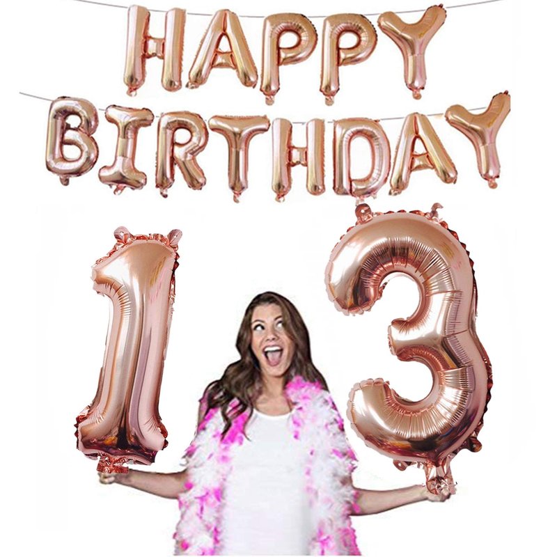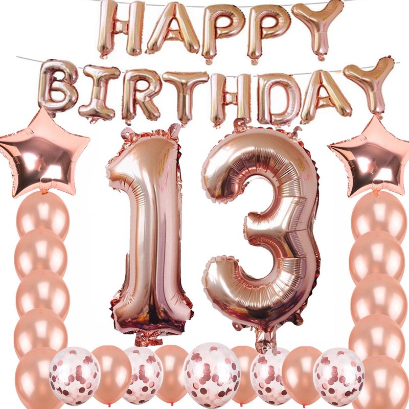 - Package includes: 40 Inch rose gold foil balloons "13" set, 16 inch "HAPPY BIRTHDAY DAY" banner balloons,2pcs 18 inch mylar star balloons,,5 pcs confetti balloons and 10pcs latex balloon