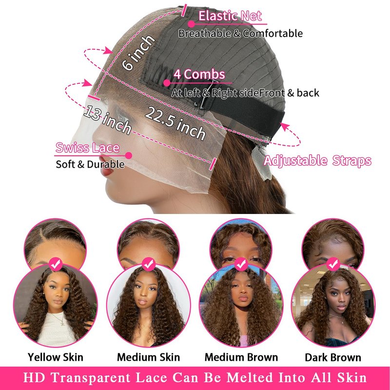 - 【12A High Quality, Can be Dyed and Curled】: 4# color gorgeous natural frontal wigs human hair pre plucked bleached knots, can be dyed, straightened, bleached and restyled as you like, natural and healthy, comfortable against skin.