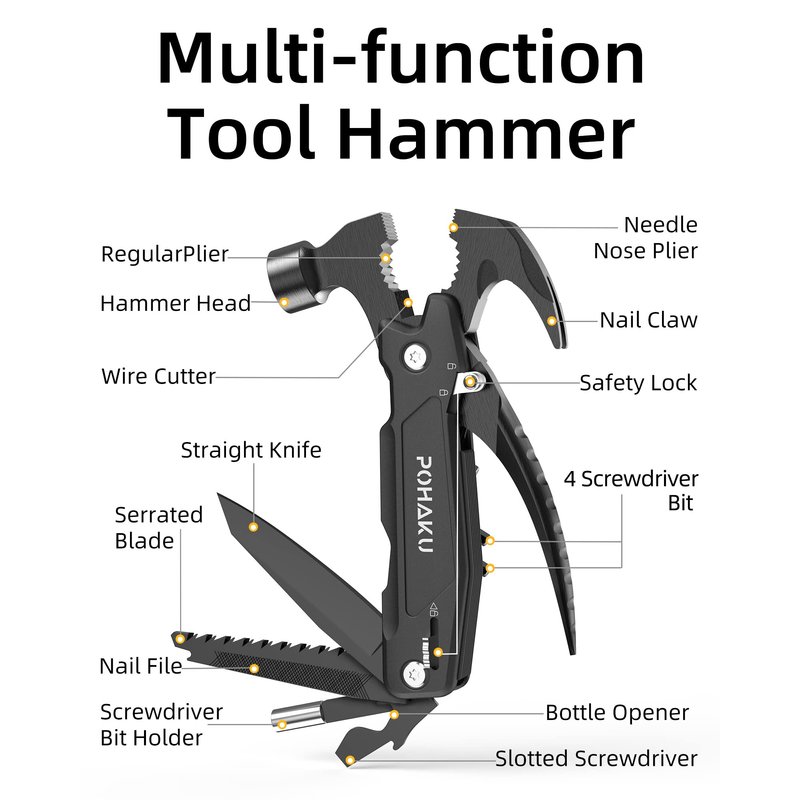 - Premium 14-in-1 Multitool Hammer. This rust-proof one-piece multitool is made of 3CR13 steel with high hardness, and the claw hammer/plier/can opener/4 replacement bits can meet your various needs.
