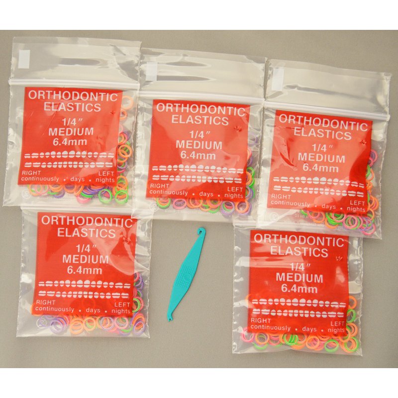 Orthodontic Elastic Rubber Bands are the highest quality medical grade bands on the market today. These are the best quality elastics you will ever find. Each package is checked and the force is measured for accuracy and consistency. Intended use is orthodontics, braces, tooth gap, and rubber bands can also be used for hair braids, pony tails, top knots, horse braids, horse manes, model airplanes, crafts, doll hair, fishing lures, dreadlocks, dreads, cornrow, wigs and many other uses. 500 Pack (you will receive 5 packs of 100 bands)