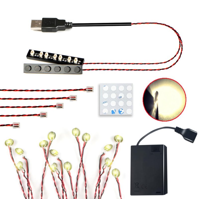 These ultra-thin LED lights are perfect for lighting up models, small decorations, and more. Each LED is only 0.18 inches (4.6 mm) in size, and can be stuck to any surface with double-sided tape. Compatible with: Can be installed on LEJOGA or model hand, jewelry, etc. The required lighting for items. Easy to use: The ultra-fine connection cable is very easy to hide. Provides 1 USB power adapter, with 2 connectors per connector, each with 7 led lights. Just plug in the USB port to light up 14 LED lights. Long connection cable: The power adapter and led light have independent connection cables, each with a length of 19.7 inches, 50 cm, suitable for extending extremely long lengths. USB power supply: Can be powered by commonly used power sources such as power banks, chargers, laptops, etc. to charge LED lights.