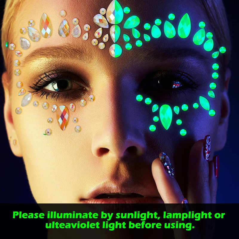 - Nice Makeup Set: you will receive 4 sheets of jewel stickers, 4 sheets of chest jewels stickers and 6 boxes chunky glitters in different colors glow in the dark; Even in a completely dark night, these body jewels can shine brightly; Please illuminate these body jewels in light or sunlight before use, which will keep the jewels glowing at night