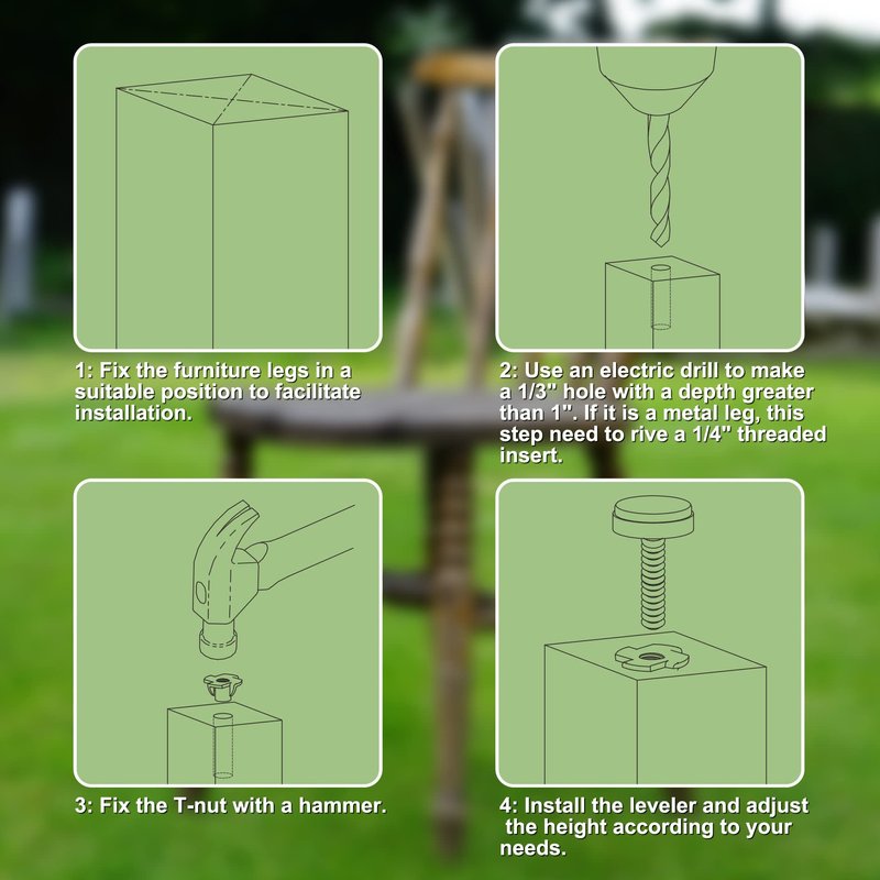 - 【Note】This product is recommended for indoor or outdoor wood furniture with the leg diameter greater than 1", such as coffee table,dining chair,etc. If less than this size, there is a risk of cracking during installation.