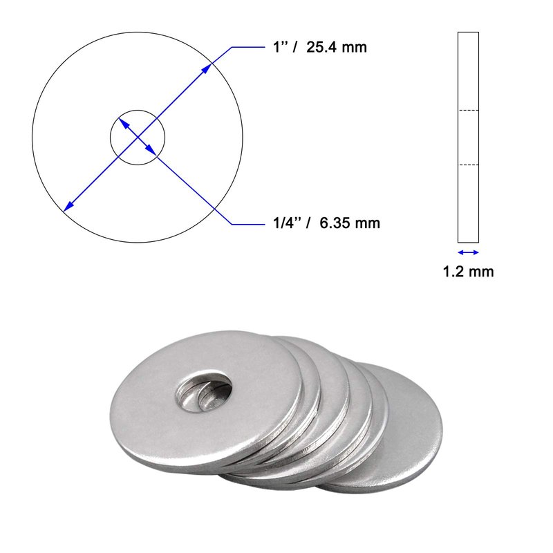 - 【Flat Washer Size】➤120Pcs 1/4" x 1" Stainless Fender Flat Washers.Inside Diameter:1/4";Outside Diameter: 1" ;Thickness: 1.2mm.