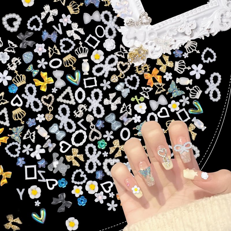 You will receive a package of 40 pcs of silver&gold alloy nail gems with rhinestone and 100 pcs multi shape white acrylic nail charms. Sufficient quantity and diverse style nail charm to meet your daily design and replacement needs