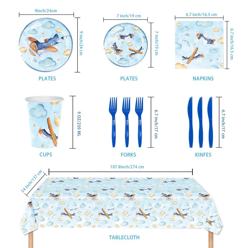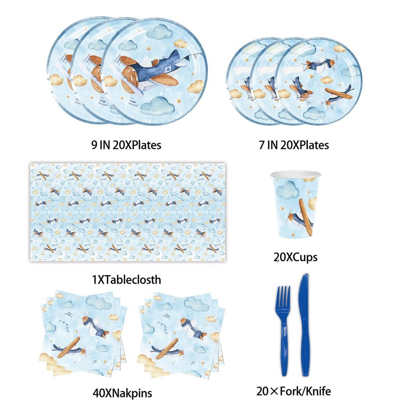 - 【Package Include】This airplane tableware set include 20pcs 7’’ plates, 20pcs 9’’ plates, 20pcs paper cups, 20pcs forks, 20pcs knives, 40pcs napkins and a large enough tablecloth(53.9*107.8in),the cool plane pattern is very attractive,bring your friends along for a cool airplane bash.