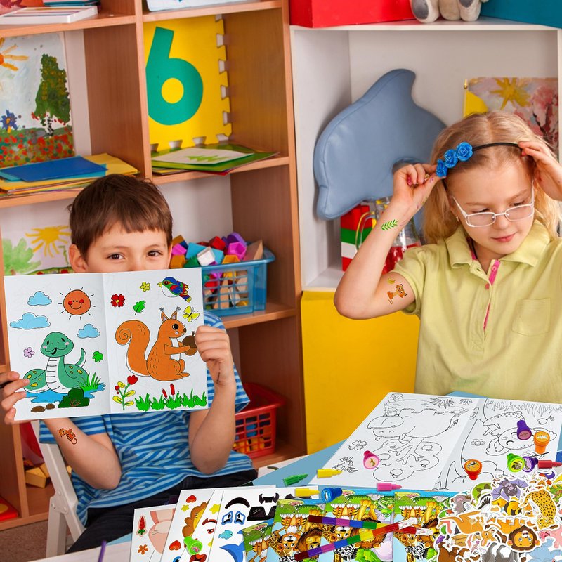 - Jungle Safari Favors Set: you will get a total of 144 pcs wild animals party favors, including 24coloring books(12 pages per book), 24 rainbow stacking crayons(8 colors),24 tattoos, 24 stampers, 24 DIY Art Craft stickers, 24 pvc stickers, sufficient quantity, and various styles enrich your zoo theme party