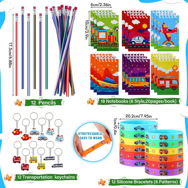 - Transportation Party Favors: you will receive 144 pieces of transportation birthday party supplies, including 12 transportation drawstring bags, 12 transportation silicone bracelets, 16 transportation DIY stickers, 18 transportation notepads, 12 transportation button pins, 12 keychains, 12 soft pencils and 50 transportation themed stickers, enough for your daily use and party favors needs, enjoying the nice transportation party with friends