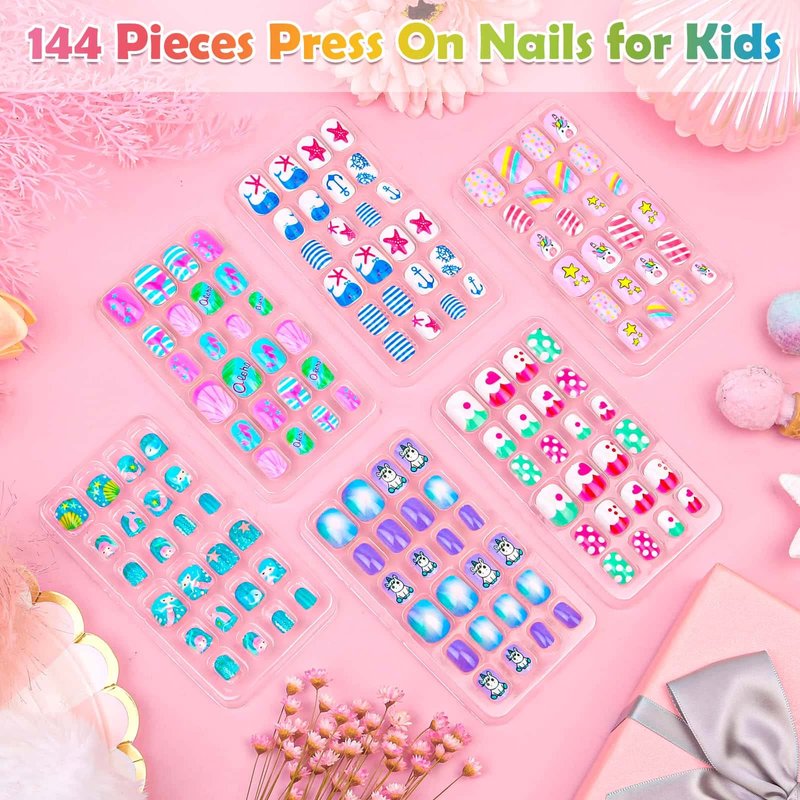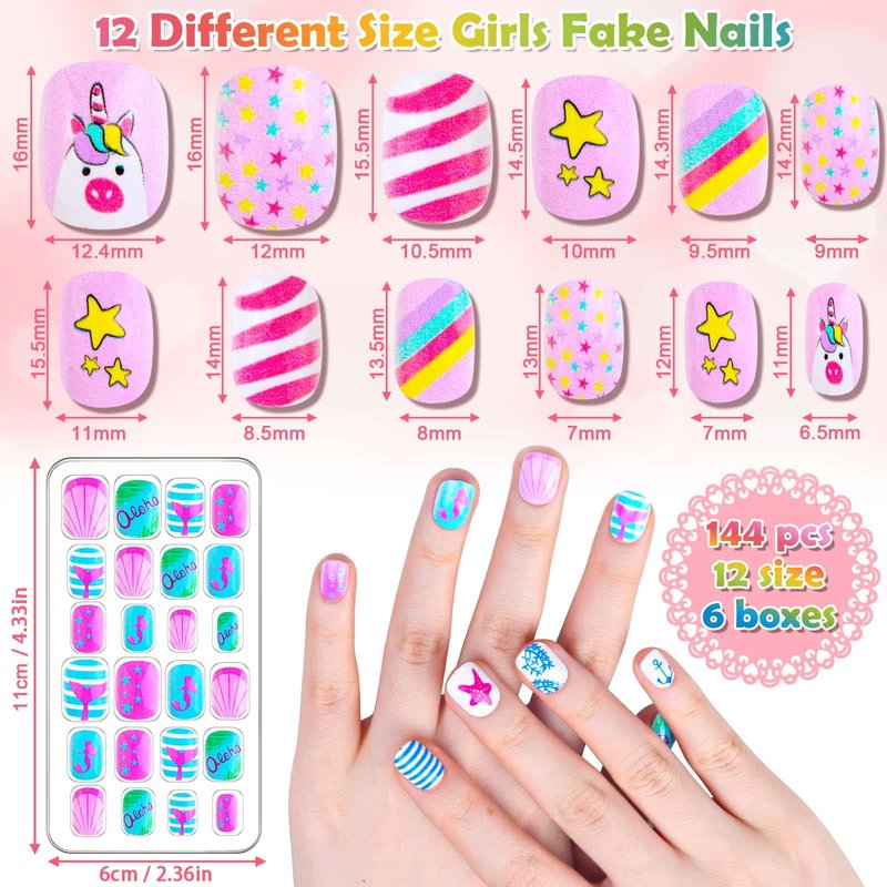 144 pieces press on nails for kids are designed with rich cute patterns, such as mermaids, shell, unicorn, stars, rainbow, heart, starfish, whales, stripes and more. Girls press on nails are ideal for the kids nail art decoration, suitable for Christmas, Halloween, fancy dress parties, weddings, parties, daily wear, etc..