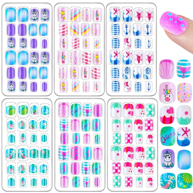 - 🦄【Summer Style Kid Fake Nails】Stick on nails for girls are designed with various cute patterns including mermaids, shells, unicorns, stars, rainbow, hearts, starfish, whales, stripes, and more, can meet different dressings for days, suitable for both boys and little girls to DIY their own nail styles as they like