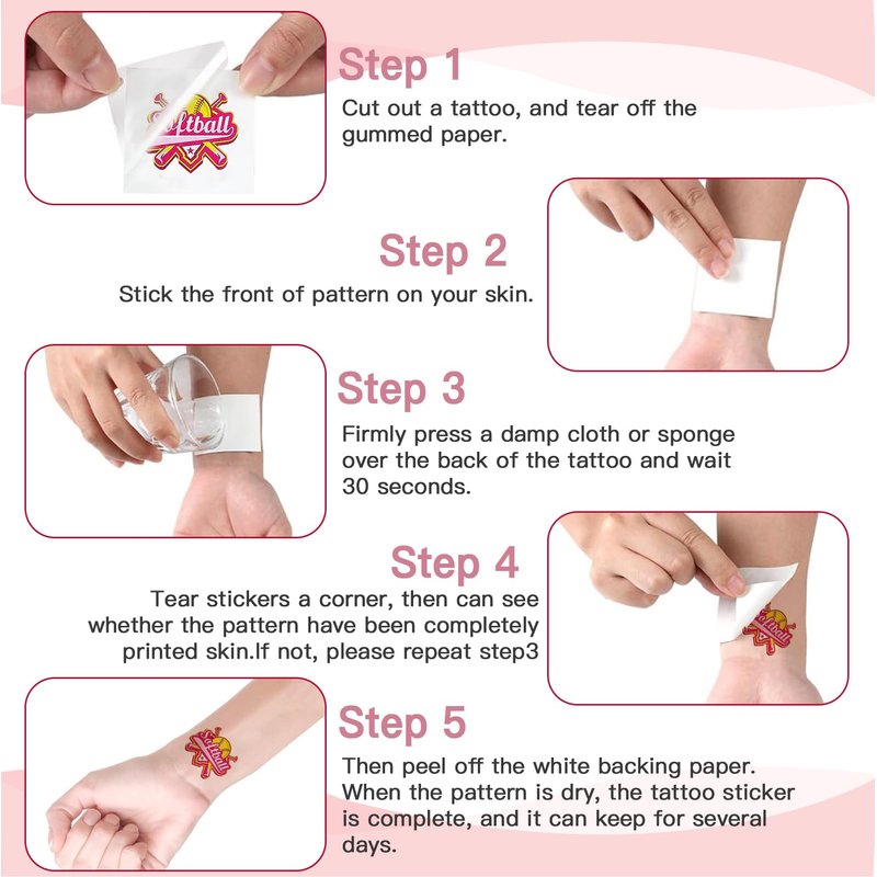 Softball temporary tattoo stickers are easy to use, you need to cut out the tattoo pattern first, tear off the surface film, then wet with water, press for about 20 seconds, and finally gently tear off to get the team tattoo; Keep the tattoo out of water for 2 hours to prolong its existence.