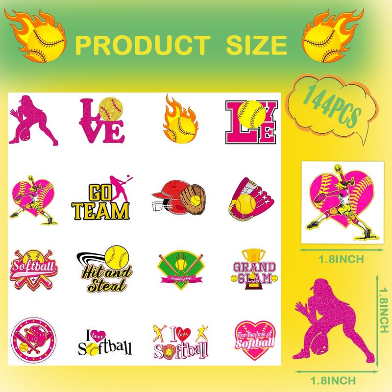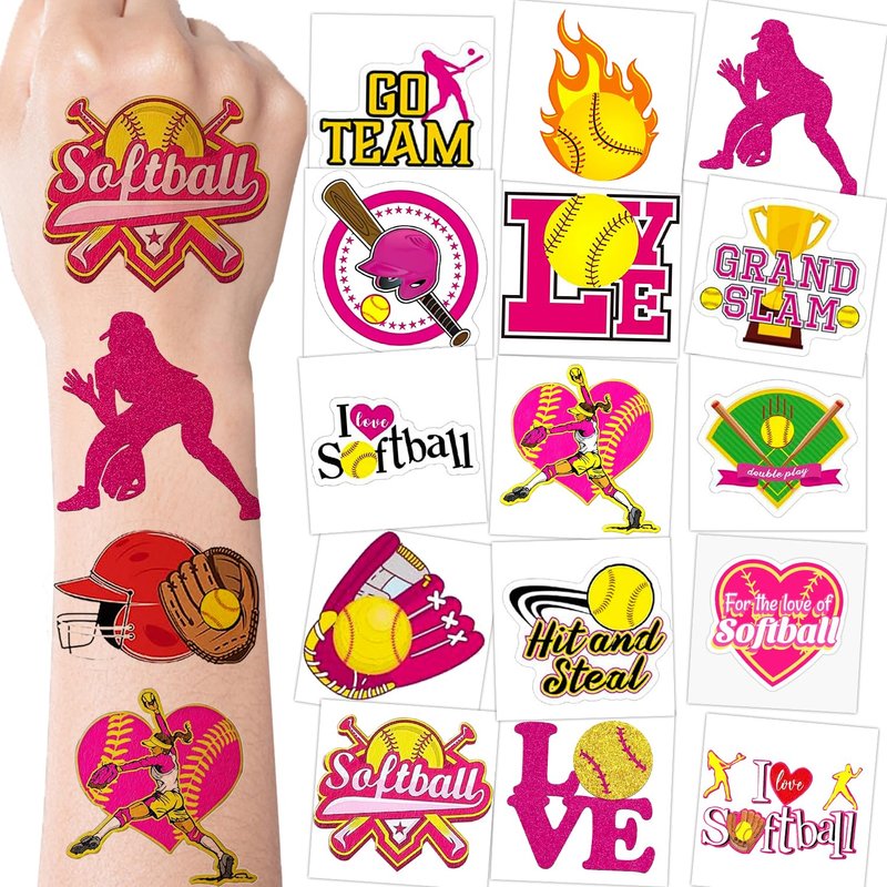 - Softball Gifts: Softball tattoos set package comes with 144 pieces softball temporary tattoos in 16 patterns. Super cute softball gifts for girls, softball accessories tattoos sticker are colorful and full of sports elements, you can also share these softball stuff with your softball team classmates, family or friends.