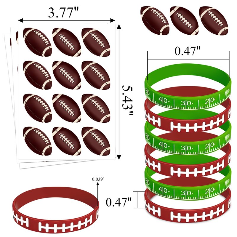 - Football party decorations Favors includes 120 pieces of Brown Football themed temporary tattoos and 24 pieces Green and Brown Football Silicone Bracelets Wristbands