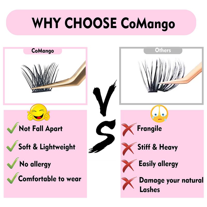 - 【Will Putting 144 Eyelash Clusters Into a Small Box Cause the Shape of the Lash cluster to Change?】 The answer is not. CoMango's special heating process makes the curl and shape of the DIY eyelash extensions more stable. Even if you rub it with your hands, you will not easily change the curvature and shape of the individual lashes cluster.