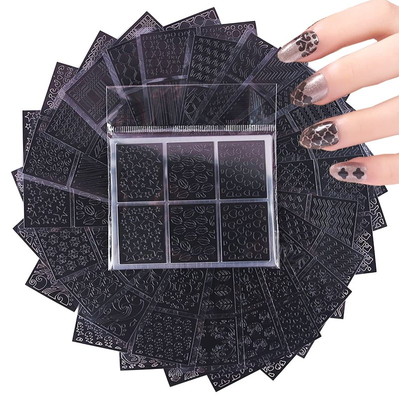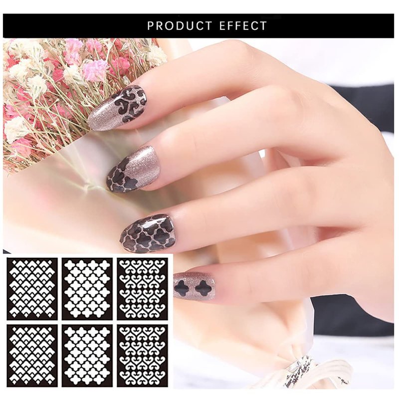 - Various patterns of nail art stencils. The package contains 24 sheets, each containing 6 small pieces with 3 different patterns, for a total of 144 small pieces of nail stencil stickers.