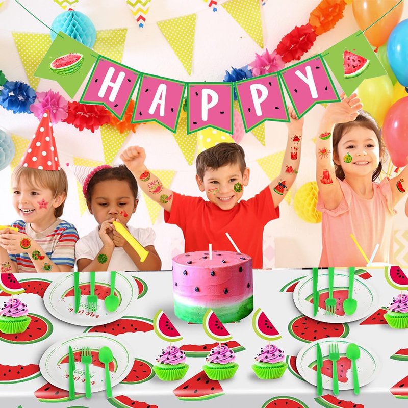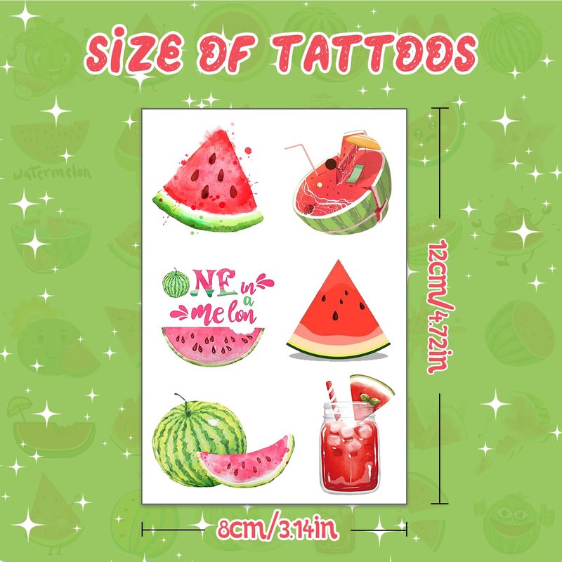 - Watermelon Party Favors: Each sheet measures 3.2 " x 4.7 " creating the perfect size tattoos! Add a more fun to any watermelon birthday party. You will get 24 sheet watermelon tattoos.