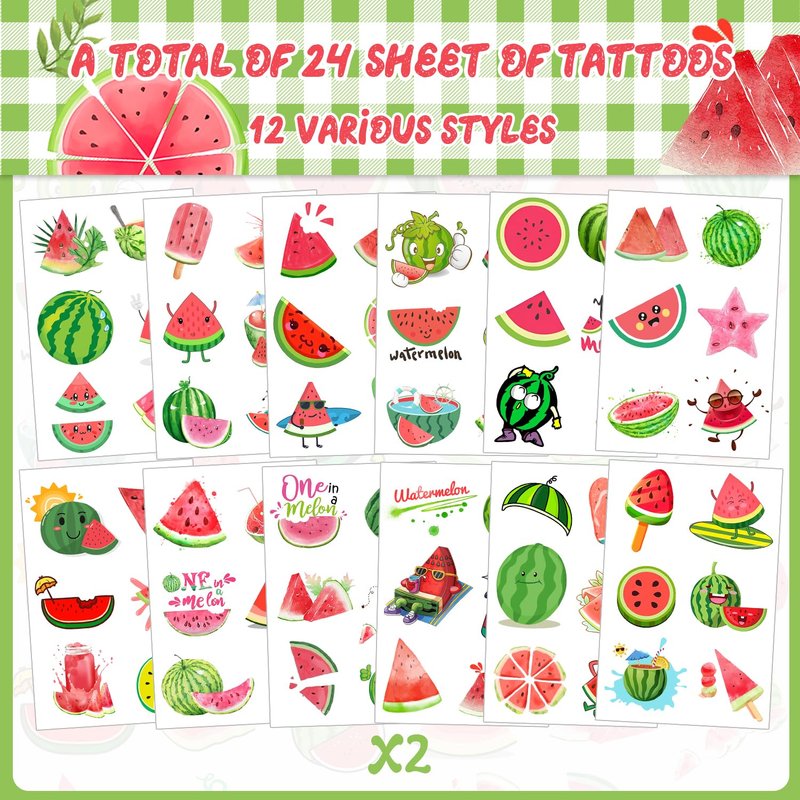 - Watermelon Party Supplies: Cute watermelon temporary tattoos play at the party, 12 sheets X 2 same patterns of each sheet, a total of 144 patterns for kids and can be worn arms, faces, hands anywhere you want a touch of glamour! Watermelon temporary tattoo stickers, including various cute cartoon characters, colors are bright, and designs are adorable, which are attractive to kids, suitable for both boys and girls.