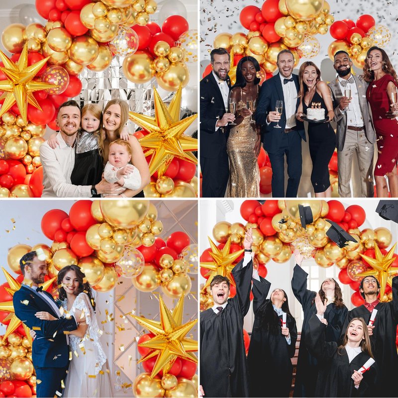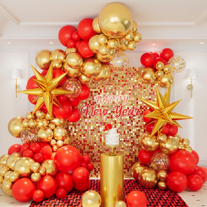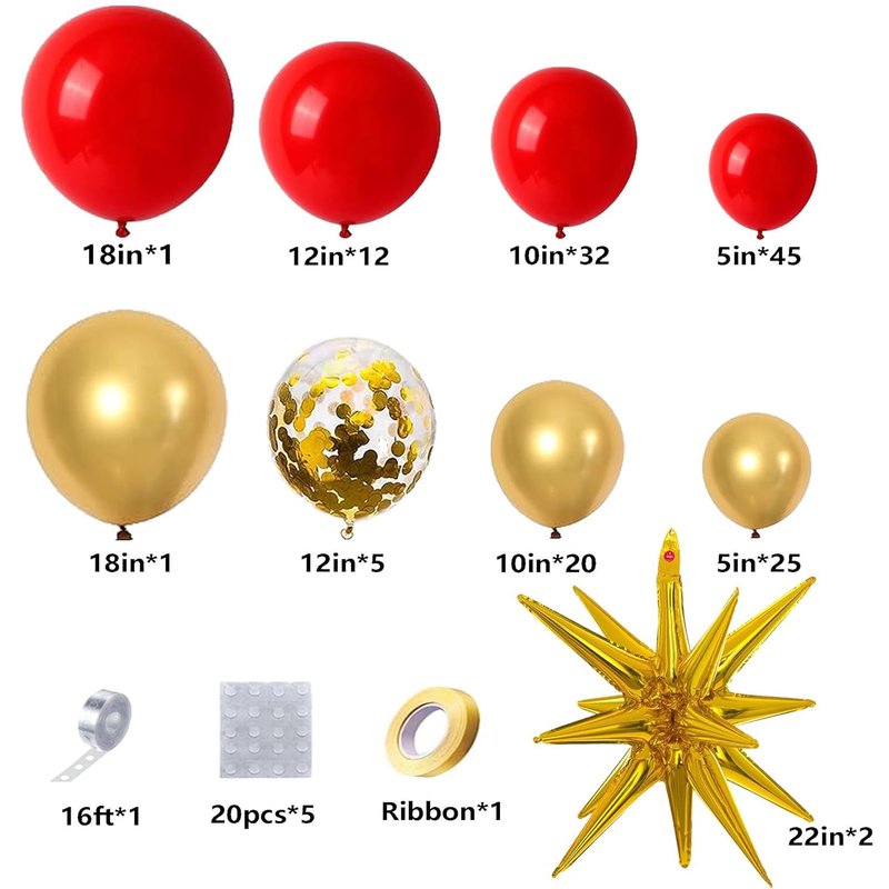 - Packaging Includes: 146pcs Happy New Year balloons, including 18in(red balloon*1, gold balloon*1), 12in(red balloons*12, gold confetti balloons*5),10in(red balloons*32, gold balloons*20), 5in(red balloons*45, gold balloons*25), 22in gold exploding star connected balloons*2, 100pcs glue*1, ribbon*1, 16 ft balloon strip*1