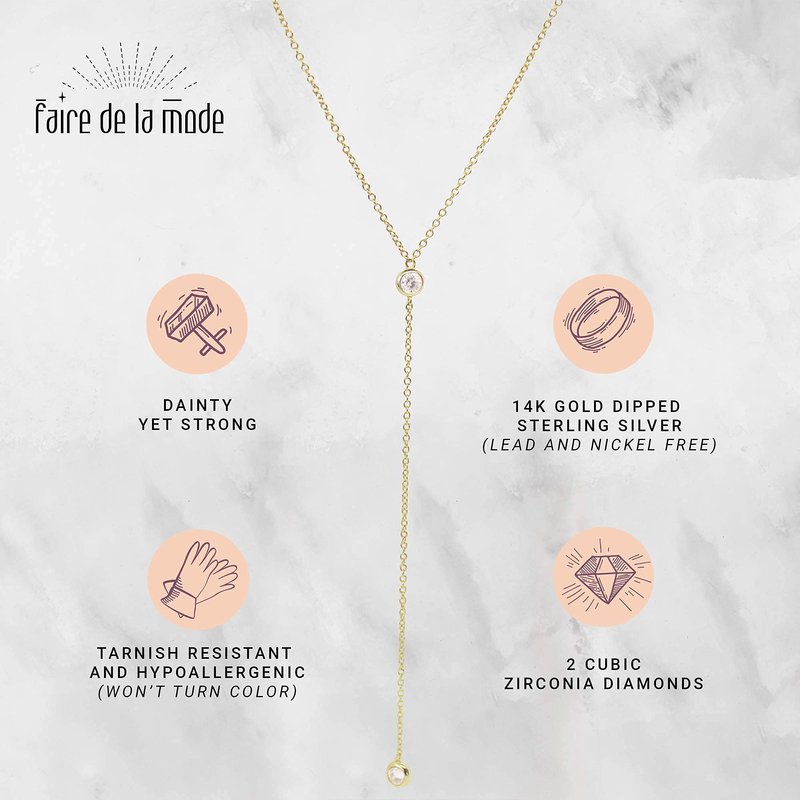 14k Vermeil Dainty Drop Y Lariat Necklace with Diamond, Gold Drop Necklace, Gold Necklace Formal Wedding Guest Jewelry for Women, Womens Necklaces Trendy (Gold, Double CZ Lariat)