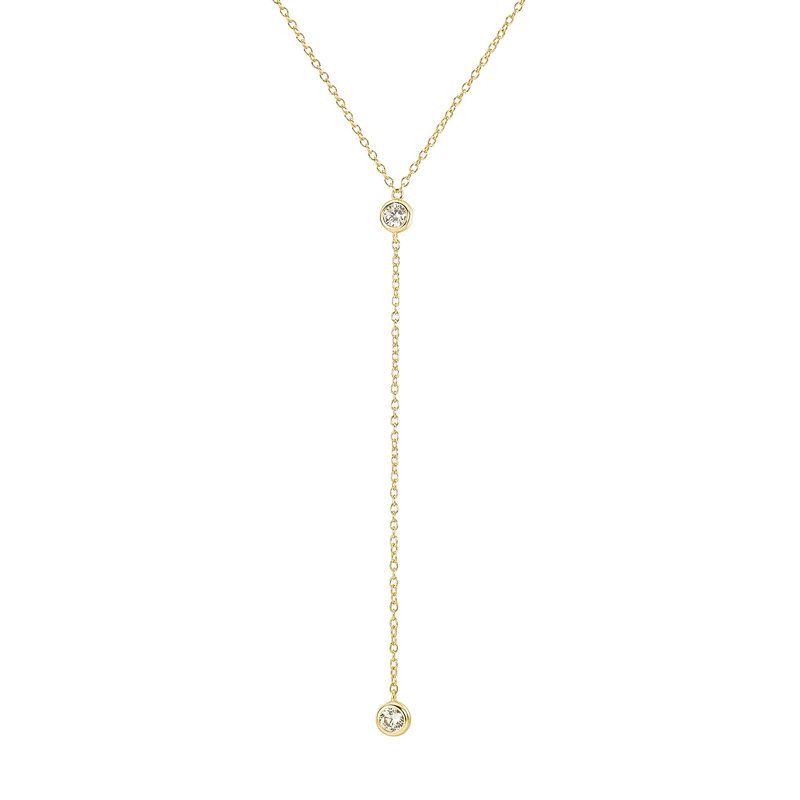 - A romantic simple gold drop necklace featuring 2 bezel set sparkly Cubic Zirconia diamonds.