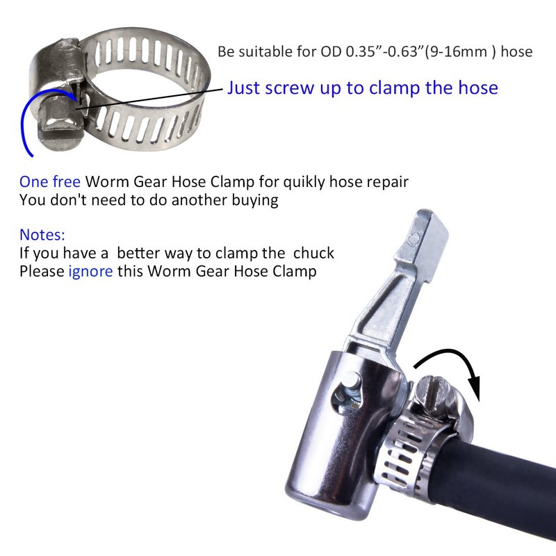 *One free Worm Gear Hose Clamp for quickly hose repair you don't need to do another buying, be suitable for OD 0.35"-0.63"(9-16mm ) hose, but if you have a better way to clamp the chuck, please ignore this Worm Gear Hose Clamp