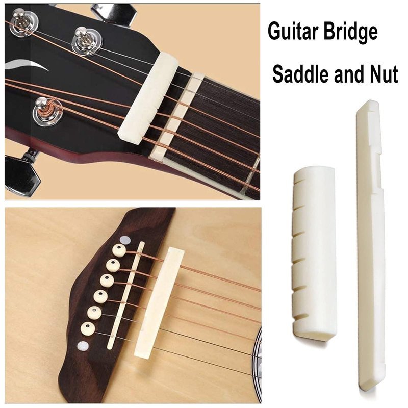 - ❤️Acoustic Guitar Replacement Parts: 6 Ivory Bridge Pins For Acoustic Guitar and 6 Black Acoustic Guitar Nail Bridge Pins , 1 Guitar Bridge Saddle, 1 Guitar Nut, 1 3-in-1 Guitar Bridge Pin Puller, perfect guitar care tools for damaged guitars, old guitars.