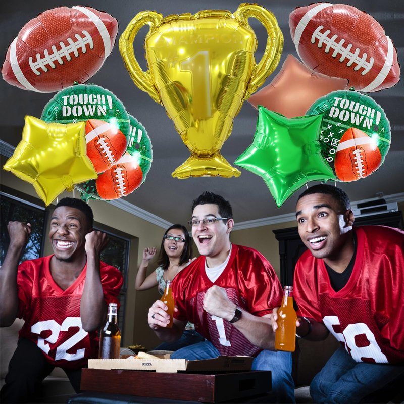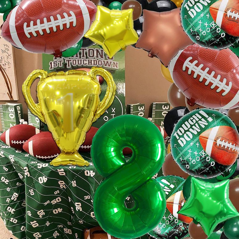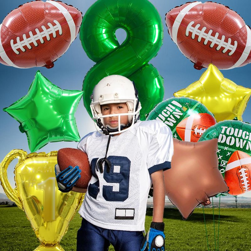 - Football Balloons: Football birthday party decorations with 14pcs, include 40 inch green number balloon, 3 (18 inch) football foil balloons, 3 (18 inch) football round green balloons, 3 (18 inch green gold brown) star balloons, 26 inch trophy cup balloon, 2 green ribbon and 1 straw. Everything you need to make the most exciting atmosphere in a complete sports theme birthday party decorations.
