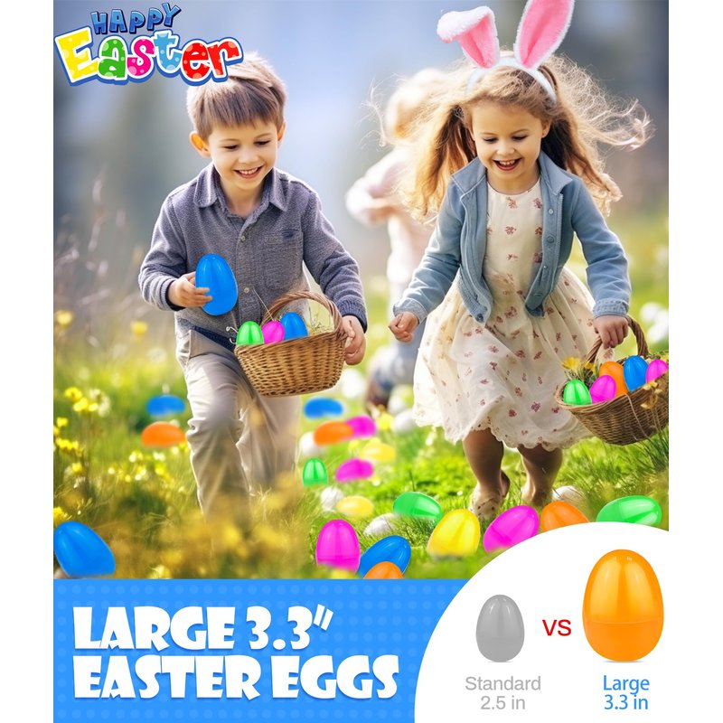 - 【3.3-inch Jumbo Colored Plastic Easter Surprise Eggs】These Easter egg toys are made of high-quality plastic materials. Child-safe (6 colors: blue, green, yellow, purple, red, pink). Easter eggs can be customized with different finger puppets. Children will be amazed by the Easter eggs they find! Size: 3.3 inch (H) * 2.4 inch (W).