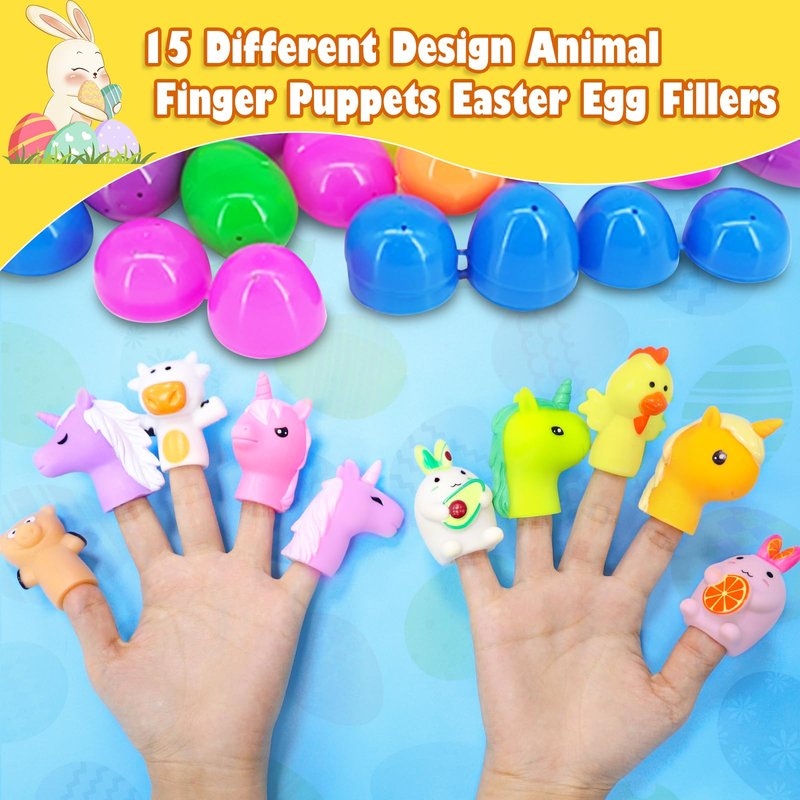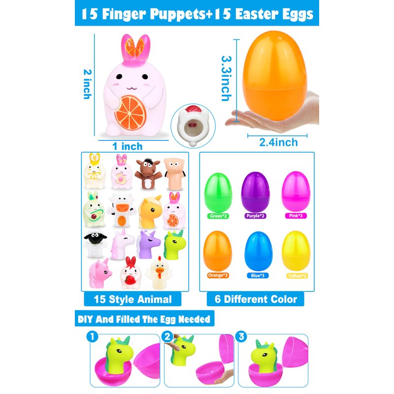 - 【15 Pack Animal Finger Puppets Easter Egg Fillers】The set includes 15 Jumbo Easter surprise eggs (6 colors, Size: 3.3 inch (H) * 2.4 inch (W)), and 15 animal finger puppet toys (7 designs, Size: 2 inch (H) * 1 inch (W)). Friendly reminder: Please assemble these toys into Easter eggs on your own.