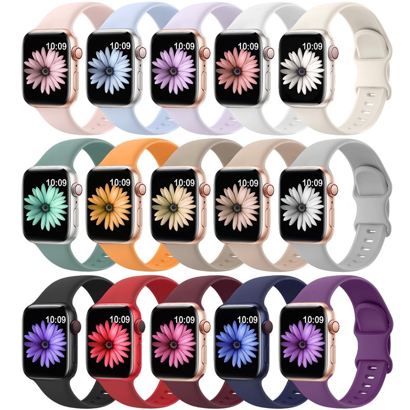 - 【Change Colors at Will】There are 15 different color sport bands combinations in one pack, you will have all the most popular colors of the moment,Multiple colors like black,white,starlight,marigold,pink sand,stone,Milk Tea,Lavender,navy blue and so on. And complementary to almost anything you wear, a great choice for your Apple watch accessories.