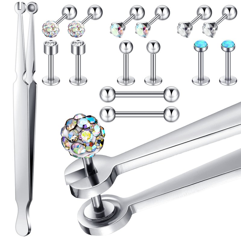 15 Pcs Piercing Kit Piercing Ball Grabber Tool Piercing Barbell Clamps Piercing Forceps Stainless Steel Pliers Jewelry Clamp Tweezers Labret Ear Studs Lip Studs Tongue Studs Piercing Removal Tool