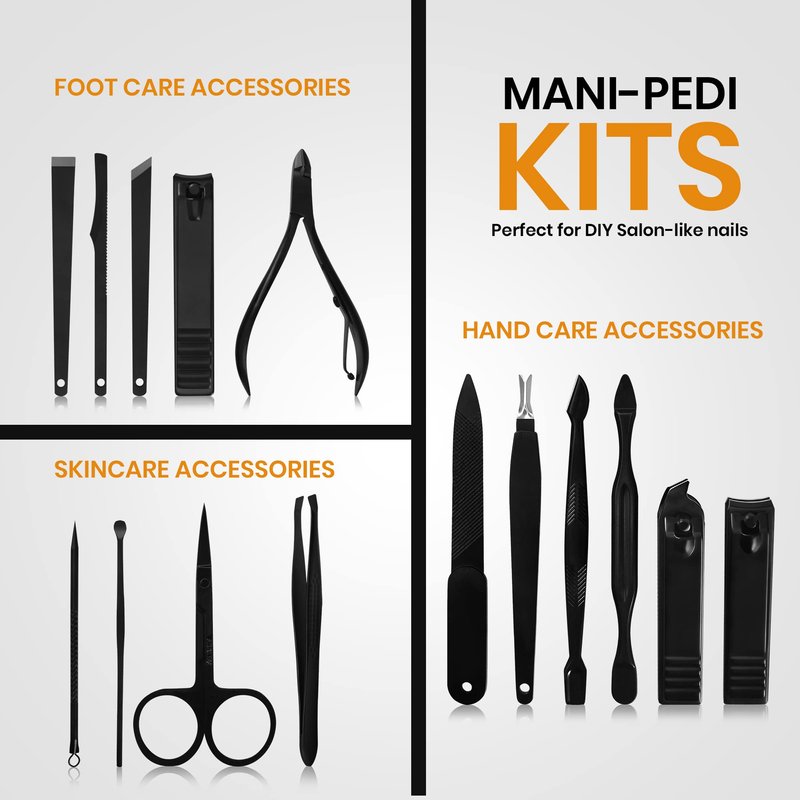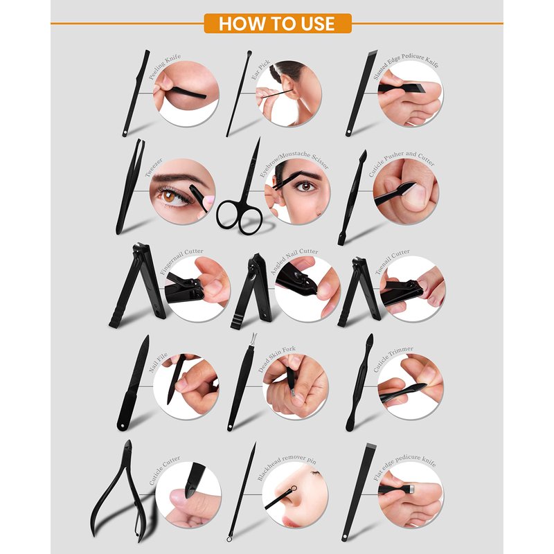 - 15 PCs MANICURE KIT- High quality, beautifully made manicure set; ideal for foot, hand and facial care. The set contains nail clippers for finger and toenails, peeling knives, cuticle trimmers, toenail nipper, nail file, v-shaped push stick, eyebrow tweezers, multi-purpose scissors, blackhead needle with loop remover and an ear pick
