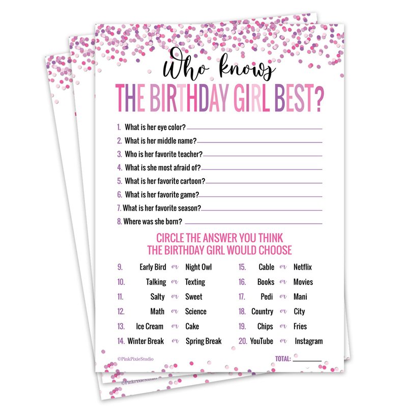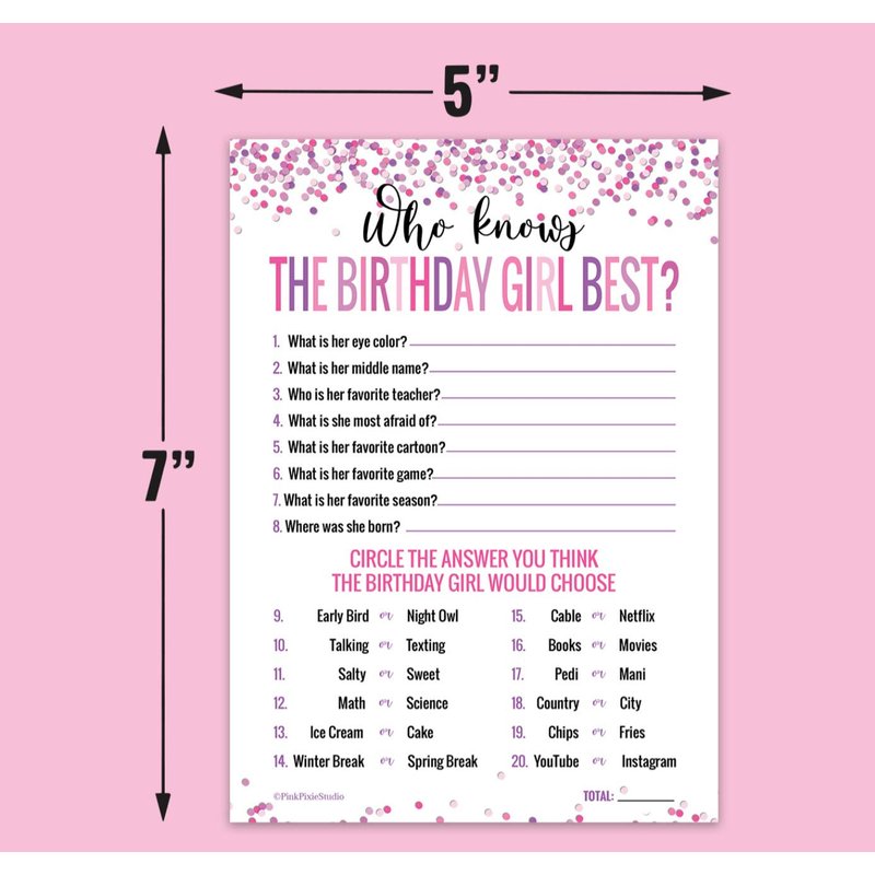 15 Who Knows The Birthday Girl Best Game Cards- for Child or Teen- Fun and Easy Game for Party or Sleepover- Girl Birthday Supplies, Activity, Decorations