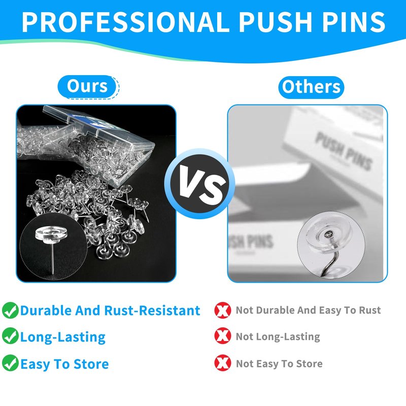 Enhance your organization and creative projects with our Premium Clear Push Pins. This set of 150 push pins is designed for versatile use, allowing you to securely fasten paper, photos, and other materials to bulletin boards, corkboards, foam boards, or cardboard. This construction ensures that the pins remain reliable and functional even after repeated use. The pins are not only durable but also resistant to rust, providing a long-lasting solution for your home or office needs. For added convenience, each set of 100 push pins comes in an independent transparent plastic box. This packaging not only facilitates easy access but also helps in keeping your desk or drawer neat and organized.