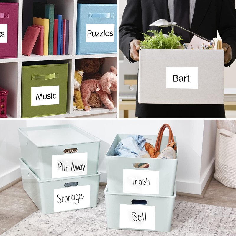 - Size: Each Large Labels For Storage Bins measures 6" x 4", and you'll receive a total of 75 sheets with 150 labels. The Removable Labels for Storage Bins feature a matte, plain white surface with ample space for writing down the desired information. We recommend using a ballpoint pen or permanent marker for application.