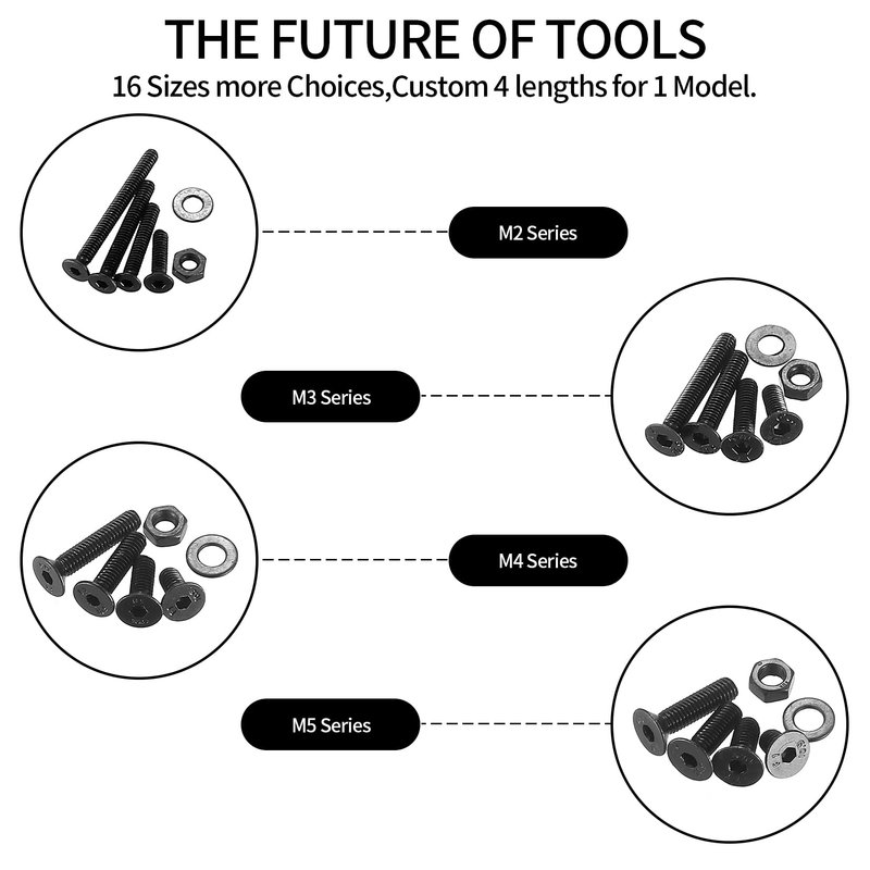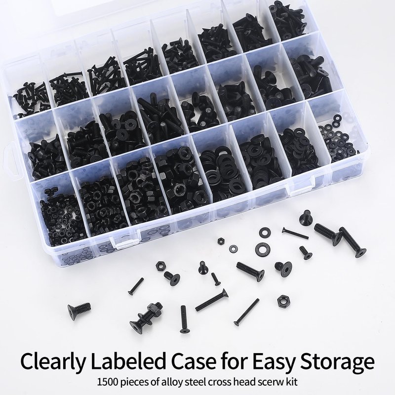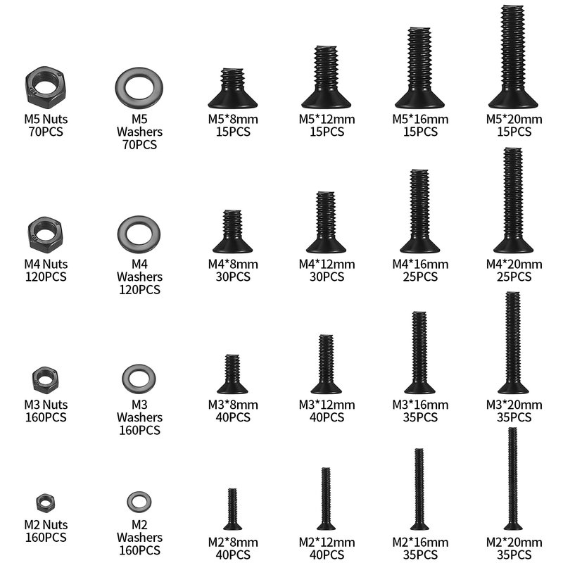 - Package Includes: 1500 pcs in total: 40 pcs m2x8mm, 40 pcs m2x12mm, 35 pcs m2x16mm, 35 pcs m2x20mm, 40 pcs m3x8mm, 40 pcs m3x12mm, 35 pcs m3x16mm, 35 pcs m3x20mm, 30 pcs m4x8mm, 30 pcs m4x12mm, 25 pcs m4x16mm, 25 pcs m4x20mm, 15 pcs m5x8mm, 15 pcs m5x12mm, 15 pcs m5x16mm, 15 pcs m5x20mm, 160 pcs m2 nuts, 160 pcs m3 nuts, 120 pcs m4 nuts, 70 pcs m5 nuts, 70 pcs m5 washers, 120 pcs m4 washers, 160 pcs m3 washers, 160 pcs m2 washers.