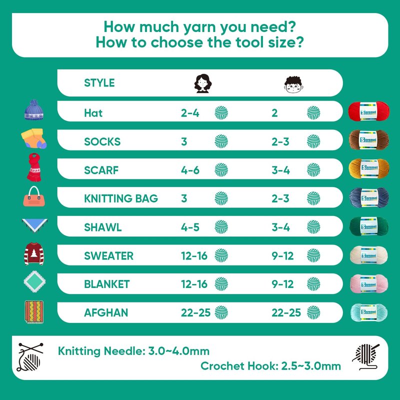 If you are a beginner or professional knitter, crochet, artisan, or if you enjoy yarn craftsmanship, then this 100% acrylic yarn is your best choice. You can weave a scarf, a hat, a shawl, and a pair of warm shoes with acrylic yarn for your lover. This multi-color yarn is not only suitable for crochet patterns, tassels, yarn embroidery, pompons, hair accessories, toys, coasters, and cushions, but also very suitable for decoration and packaging; Various types of projects or handicrafts can be paired well with this multi-colored yarn, promoting infinite creativity and versatility. There are multiple solid colors and different color packages for you to choose from, and you can choose the perfect style for your project. Each ball weighs 1.76 ounces (50 grams), 141 yards (130 meters), and 3 balls per bag. You can choose the appropriate amount of yarn for your project.