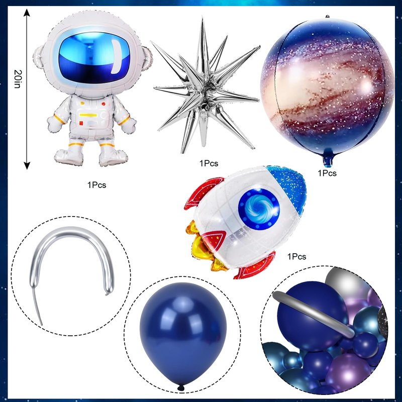 - Great Value Package:We hand-pack your space party decorations to ensure you get the following space balloon arch kit(152Pcs):Purple Latex Balloons(10"*8,5"*5)/Metallic Purple Balloons (10"*8,5"*8)/Navy Blue Latex Balloons (18"*1,12"*6,10"*18,5"*15)/Metallic Blue Balloons(12"*5,10"*5,5"*10)/Silver Latex Balloons (12"*5,10"*8,5"*10)/Metallic Silver Balloons(18"*1,12"*5,10"*5,5"*8)/Twisting Blue Balloons*3/Twisting Purple Balloons*3/Sparkling Star Balloons*12/Rocket Balloon(29"*1)/Astronaut Balloon(33"*1)/Galaxy Balloon(22"*1)/Silver Foil Balloon(22"*1),Glue Points*1,Tape Strip*1,Ribbon*1.