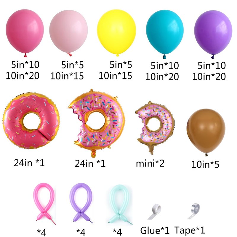 - What You Will Get:30 pcs hot pink balloons,20 pcs pink balloons,20 pcs yellow balloons,30 pcs aqua blue balloons,30 pcs purple balloons,5 pcs light brown balloons,2 pcs 24 inch donut foil balloons,2 pcs mini donut foil balloons,12 pcs twisting balloons,1 pcs balloon arch strip tape,1 roll of 100 dot glue