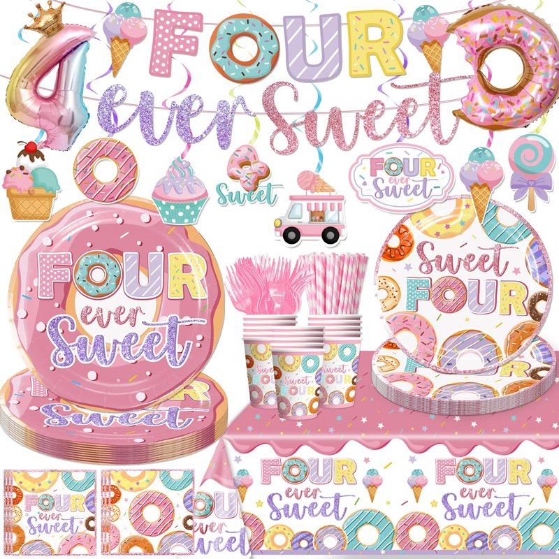 157pcs Four Ever Sweet Birthday Decorations Girl Include Banner, Hanging, Plates and Napkins, Tablecloth, Paper Cups, Forks, Straws, Donut 4th Birthday Balloons, for 4th Birthday Decorations Girl