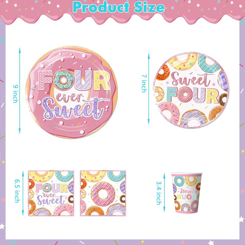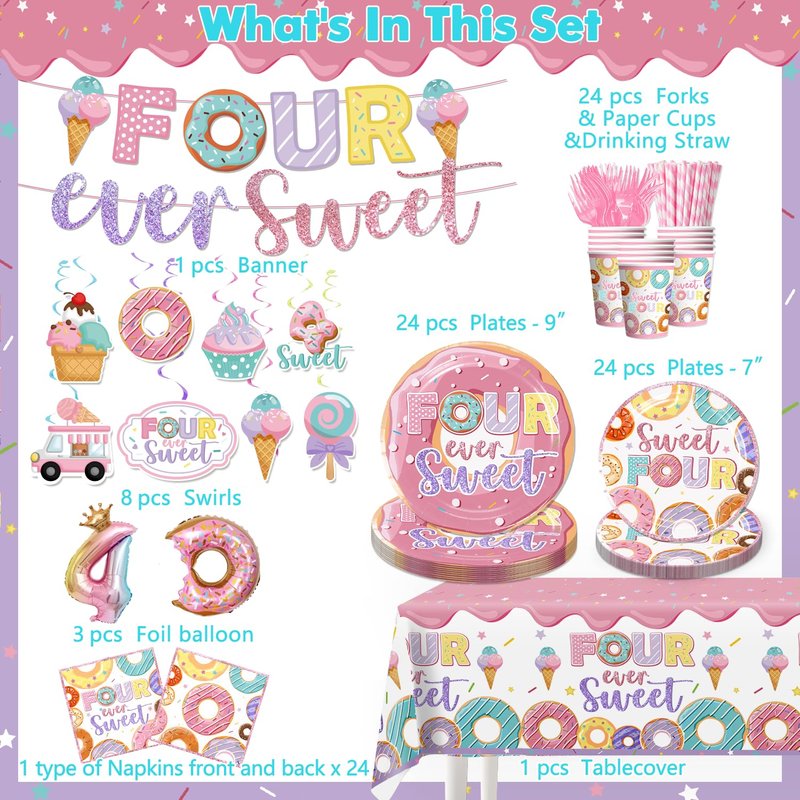 - 【Package Included】:4 ever sweet birthday decorations girl include 1pc four ever sweet banner, 8pcs hanging swirls, 24pcs 9-inch pink birthday plates, 24pcs 7-inch pink birthday plates, 24pcs paper cups, 24pcs napkins, 24pcs forks, 24pcs straws, 1pc four ever sweet tablecloth, 1pc imperial crown foil balloon, 1pc donut foil balloon, 1pc number 4 foil balloon, the set includes enough tableware to entertain 24 guests.