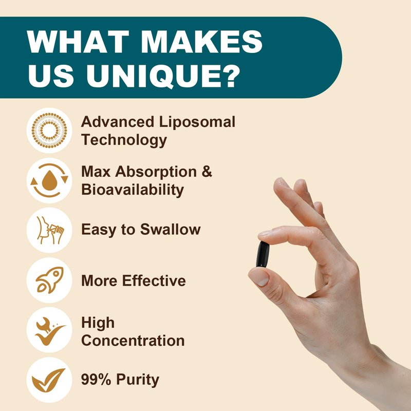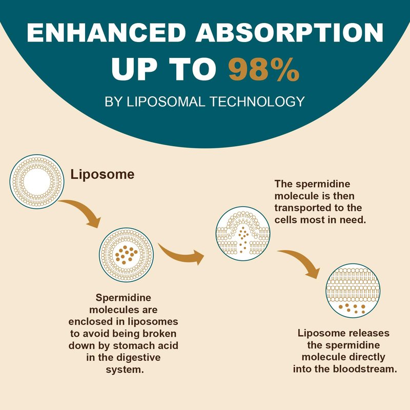 - Advanced Liposome Technology, Max Absorption & Bioavailability - Don't settle for low-absorbing spermidine capsules and tablets. We utilize advanced liposomal technology to ensure maximum absorption, delivering the spermidine molecule directly to your cells. This means you can trust that you're getting the most out of every spermidine capsule, with optimal support for your wellness. Liposomal spermidine enhanced absorption by up to 98%.