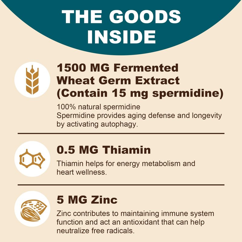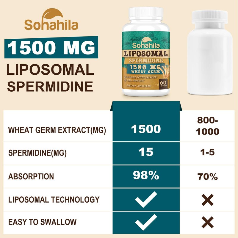 - Powerful Formula, Boost Cell Renewal & Longevity - We concentrate on your overall wellness. Our liposomal spermidine supplement is different from other spermidine supplements on the market, which is beyond traditional spermidine with 1500mg premium spermidine-rich wheat germ extract, thiamine, and zinc. Science research shows spermidine provides aging defense and longevity by activating autophagy which is the cellular renewal and recycling process.