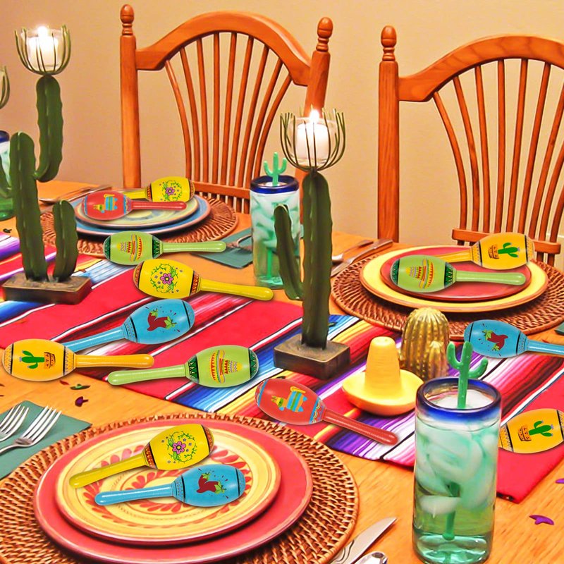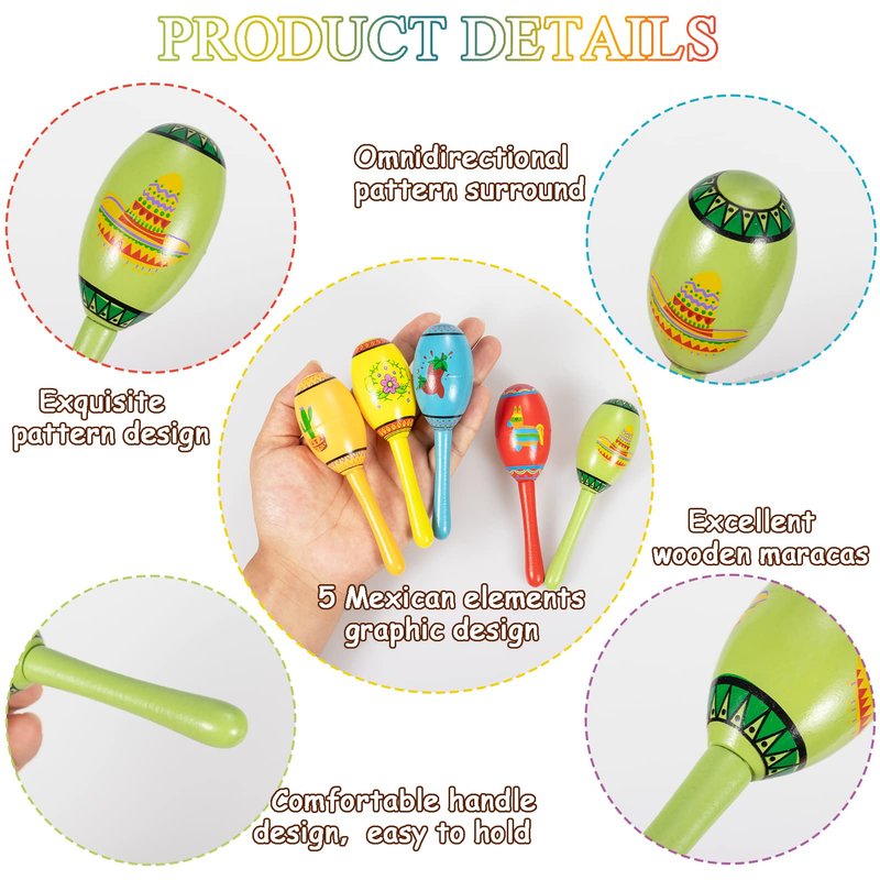 - Package: Including 15pcs kids mexican wooden maracas in 5 bright colors: red, yellow, green, ginger and blue; they’re all designed with classic mexican themed patterns like chili pepper, sombrero, cactus, pinatas, flowers, which are definitely a great choice for your mexican party decorations