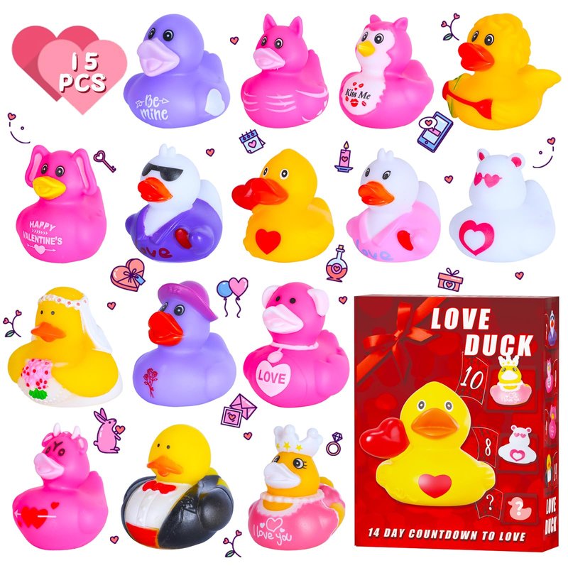 15pcs Valentine's Day Advent Calendar Rubber Ducks for Ducking,Valentine's Day Ducks for Jeeps with Box for Valentine's Party Favors Gifts Bath Toy