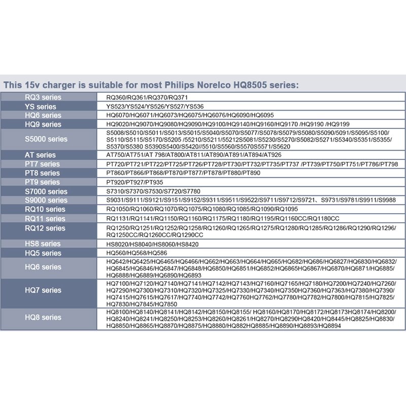 - Compatible with: our charger compatibles with HQ8505, 7000 7100 7200 7300 7400 7500 7600 7700 5000 5100 5200 5700 3000 3100 3500 4100 4200 4500 6100 8000X 8500X 8900 series shavers, most shavers, and trimmers; Compatible part numbers HQ8505 AT810/41 AT830 BT5210/42 BT7215/49 PT724/41 PT730/41 QG3364/42 QG3330 QG3330/60 QT4018/49 S7370/YS524/41, NL9206AD-4; For more modes, please view our description; We can provide relevant guidance and help so that you can buy really suitable products